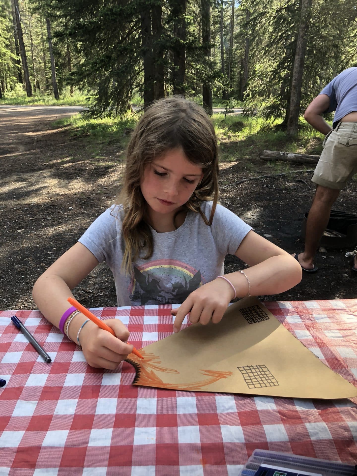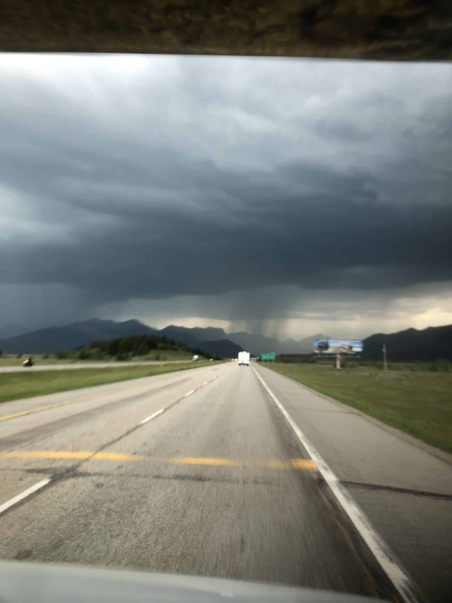 Vi er kørt mod De canadiske Rockies og ankom til vores campsite i lyn og tordenvejr. Flot så det ud på himlen med de zigzag glimtende lyn, men også en smule faretruende. Himmel og hav stod i et og vi var da også lidt i tvivl om vi turde bevæge os længere op i bjergene, da alle biler kørte modsat. Vi fandt vores campsite inde i skoven, og lige som I Yellowstone blev vi bedt om at skrive under på reglerne, især omkring bjørne. Man fornemmede dog at de var lidt mindre hys omkring det, selvom man samtidig fik opfattelsen af at bjørnene hyppigere blev spottet her. Pigen ved indregistreringen fortalte bl.a at hun forleden var gået ud fra toiletterne og havde stået ansigt til ansigt med en Bjørn. Hun havde blot sagt “good morning Bear” og så havde den vendt hende ryggen.