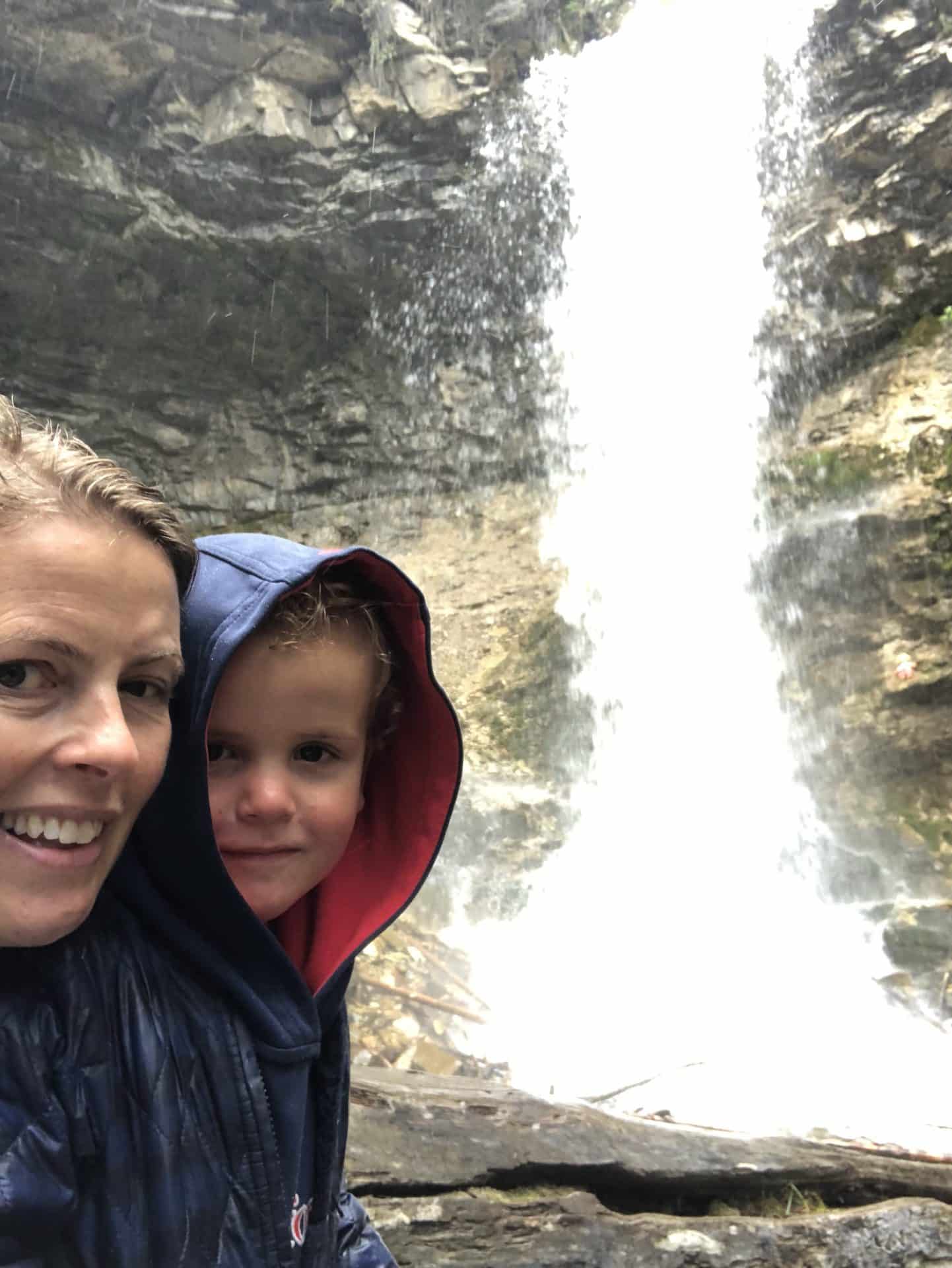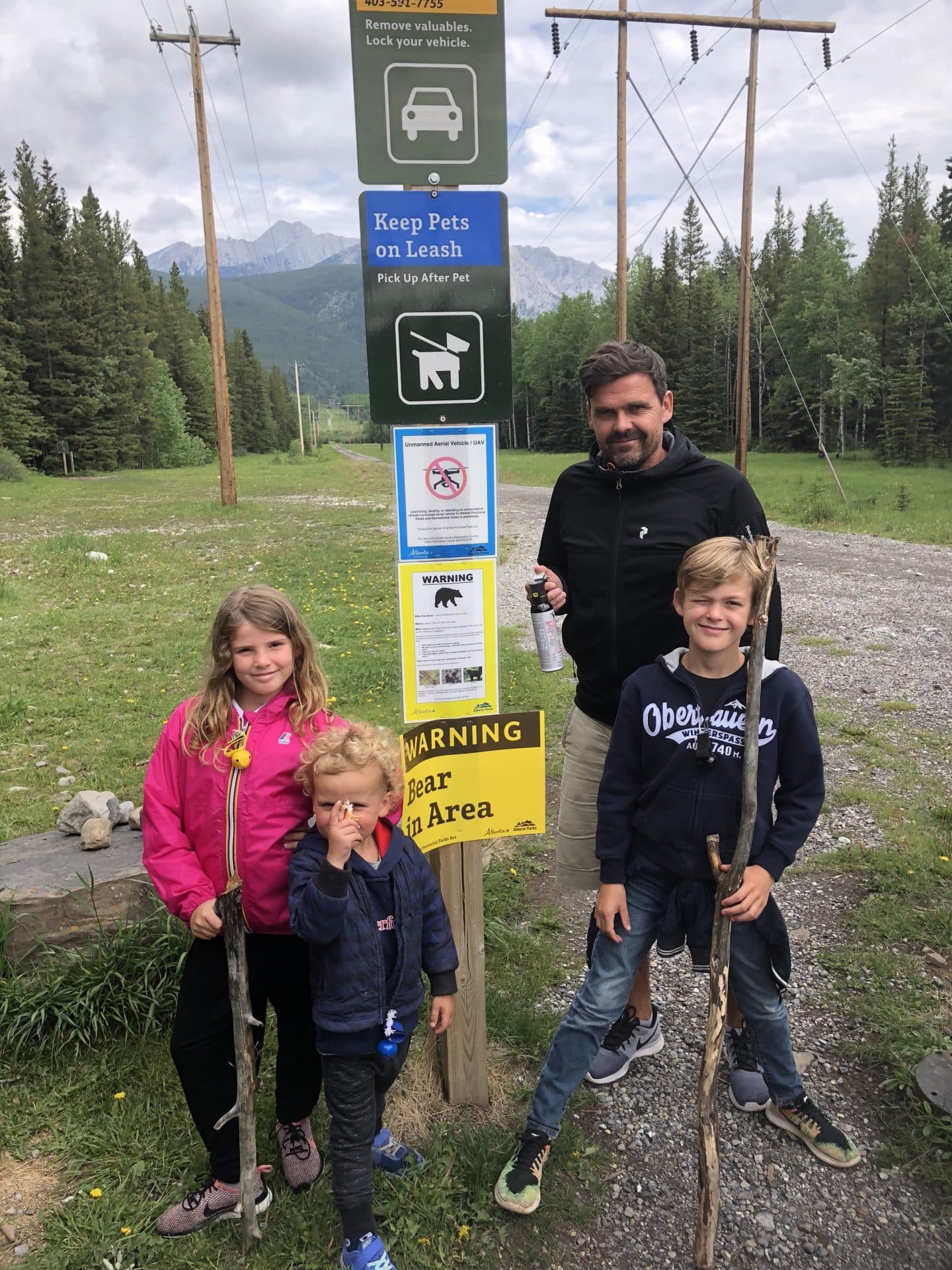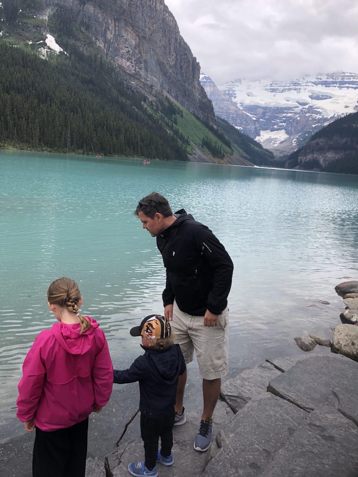 Næste morgen vågnede vi igen med regnen trommende på taget. Men vi besluttede os alligevel for at gå en lille tur ud til et vandfald der hedder Troll Falls. Da vi kom ud til parkeringspladsen blev vi mødt af et skilt hvor det stod, at man skulle tage sig i agt for bjørne, som netop var spottet dagen før på den sti vi skulle gå ad. Vi var lidt betænkelige ved det, men så at der var andre ude at gå. William blev ved med at sige, at vi altså skulle have en bear spray med…. og efter at have lavet lidt research på det og set at alle skrev “carry a bearspray-we repeat carry a bearspray”, blev vi enige om, at vi nok hellere måtte skaffe os en, inden vi begav os ud for at vandre i bearcountry. Vi fik instrukser på brugen af sprayen og blev også gjort opmærksom på, hvordan vi skulle agere ved et eventuelt møde. Ved mødet med en blackbear skal man råbe op og gøre sig så stor som mulig, ved mødet med en Grizzly skal man tværtimod tale meget sagte og trække sig langsomt tilbage, men hele tiden have øjne på bjørnen. Bevæbnet med bearspray, bjørne-bjælder og kæppe begav vi os ind i skoven, mens vi alle gik og råbte “hey Bear”. Vi kom til det fine Troll Falls vandfald. Vi opdagede små Gjøl trolde sat ved vandfaldet og i træerne-måske deraf navnet Troll Falls. Kasper var frisk på en badetur i vandfaldet, selvom det var en smule koldt. Vi mødte ingen bjørne på denne tur…. Da det fortsat ikke var det bedste vejr, drog vi mod Banff by for at gå i hotsprings. Hotsprings var virkelig varme, men ikke så naturlige som man kunne ønske sig. Vandet kom godt nok fra varme kilder i jorden, men selve badet var mere en stor udendørs swimmingpool, dog med en fantastisk udsigt til de omkringliggende bjerge. Vi gik en tur i byen, som virkelig var hyggelig men også meget besøgt af turister, der kommer for de helt igennem smukke naturomgivelser. Vi skulle være blevet en dag længere på den campingplads vi tjekkede ind på dagen før, men valgte i stedet at køre videre mod Lake Louise, en times tid fra Banff. Vi ankom til Lake Louise campground og håbede vi kunne få plads, men blev mødt af et skilt hvor der stod Fully booked. Da vi først havde reserveret plads til dagen efter, endte vi i stedet på en overflow parking, hvor vi måtte overnatte-vi var dog bestemt ikke de eneste og fik nærmest sidste ledige plads.