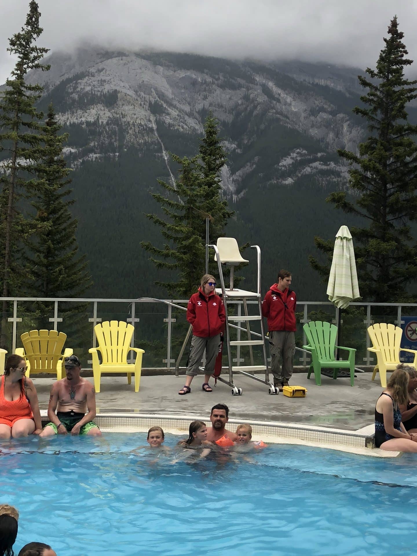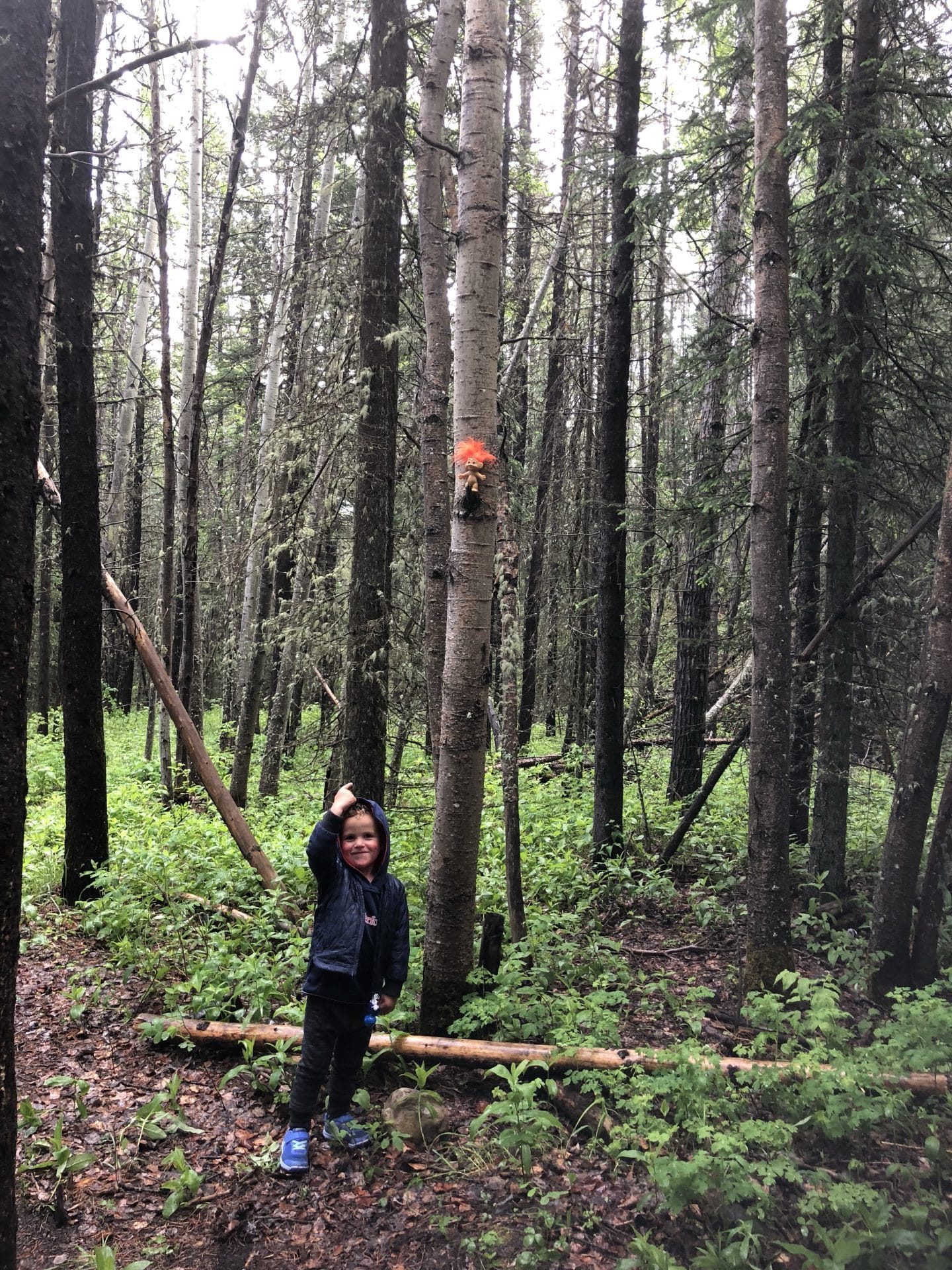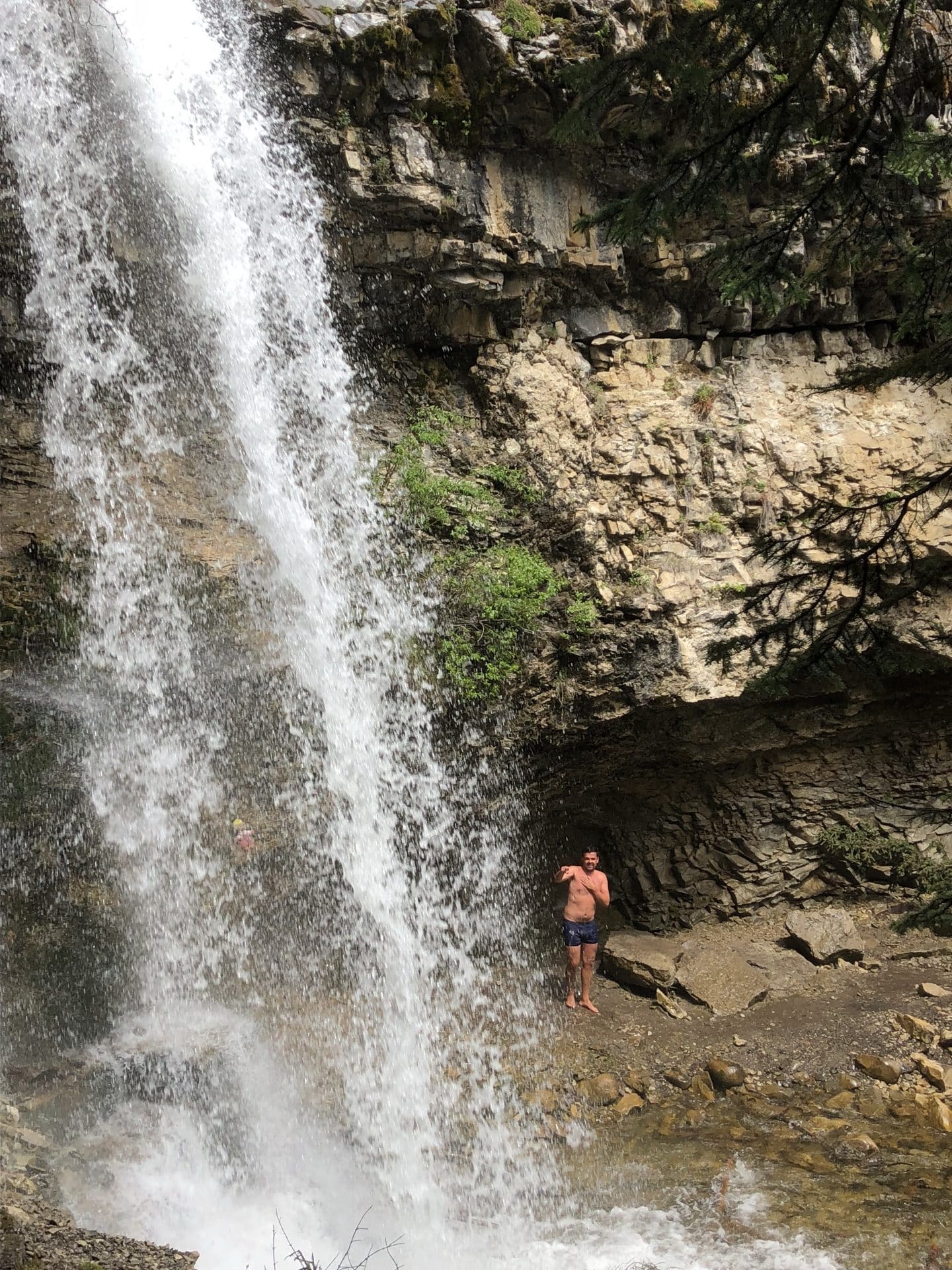 Næste morgen vågnede vi igen med regnen trommende på taget. Men vi besluttede os alligevel for at gå en lille tur ud til et vandfald der hedder Troll Falls. Da vi kom ud til parkeringspladsen blev vi mødt af et skilt hvor det stod, at man skulle tage sig i agt for bjørne, som netop var spottet dagen før på den sti vi skulle gå ad. Vi var lidt betænkelige ved det, men så at der var andre ude at gå. William blev ved med at sige, at vi altså skulle have en bear spray med…. og efter at have lavet lidt research på det og set at alle skrev “carry a bearspray-we repeat carry a bearspray”, blev vi enige om, at vi nok hellere måtte skaffe os en, inden vi begav os ud for at vandre i bearcountry. Vi fik instrukser på brugen af sprayen og blev også gjort opmærksom på, hvordan vi skulle agere ved et eventuelt møde. Ved mødet med en blackbear skal man råbe op og gøre sig så stor som mulig, ved mødet med en Grizzly skal man tværtimod tale meget sagte og trække sig langsomt tilbage, men hele tiden have øjne på bjørnen. Bevæbnet med bearspray, bjørne-bjælder og kæppe begav vi os ind i skoven, mens vi alle gik og råbte “hey Bear”. Vi kom til det fine Troll Falls vandfald. Vi opdagede små Gjøl trolde sat ved vandfaldet og i træerne-måske deraf navnet Troll Falls. Kasper var frisk på en badetur i vandfaldet, selvom det var en smule koldt. Vi mødte ingen bjørne på denne tur…. Da det fortsat ikke var det bedste vejr, drog vi mod Banff by for at gå i hotsprings. Hotsprings var virkelig varme, men ikke så naturlige som man kunne ønske sig. Vandet kom godt nok fra varme kilder i jorden, men selve badet var mere en stor udendørs swimmingpool, dog med en fantastisk udsigt til de omkringliggende bjerge. Vi gik en tur i byen, som virkelig var hyggelig men også meget besøgt af turister, der kommer for de helt igennem smukke naturomgivelser. Vi skulle være blevet en dag længere på den campingplads vi tjekkede ind på dagen før, men valgte i stedet at køre videre mod Lake Louise, en times tid fra Banff. Vi ankom til Lake Louise campground og håbede vi kunne få plads, men blev mødt af et skilt hvor der stod Fully booked. Da vi først havde reserveret plads til dagen efter, endte vi i stedet på en overflow parking, hvor vi måtte overnatte-vi var dog bestemt ikke de eneste og fik nærmest sidste ledige plads.