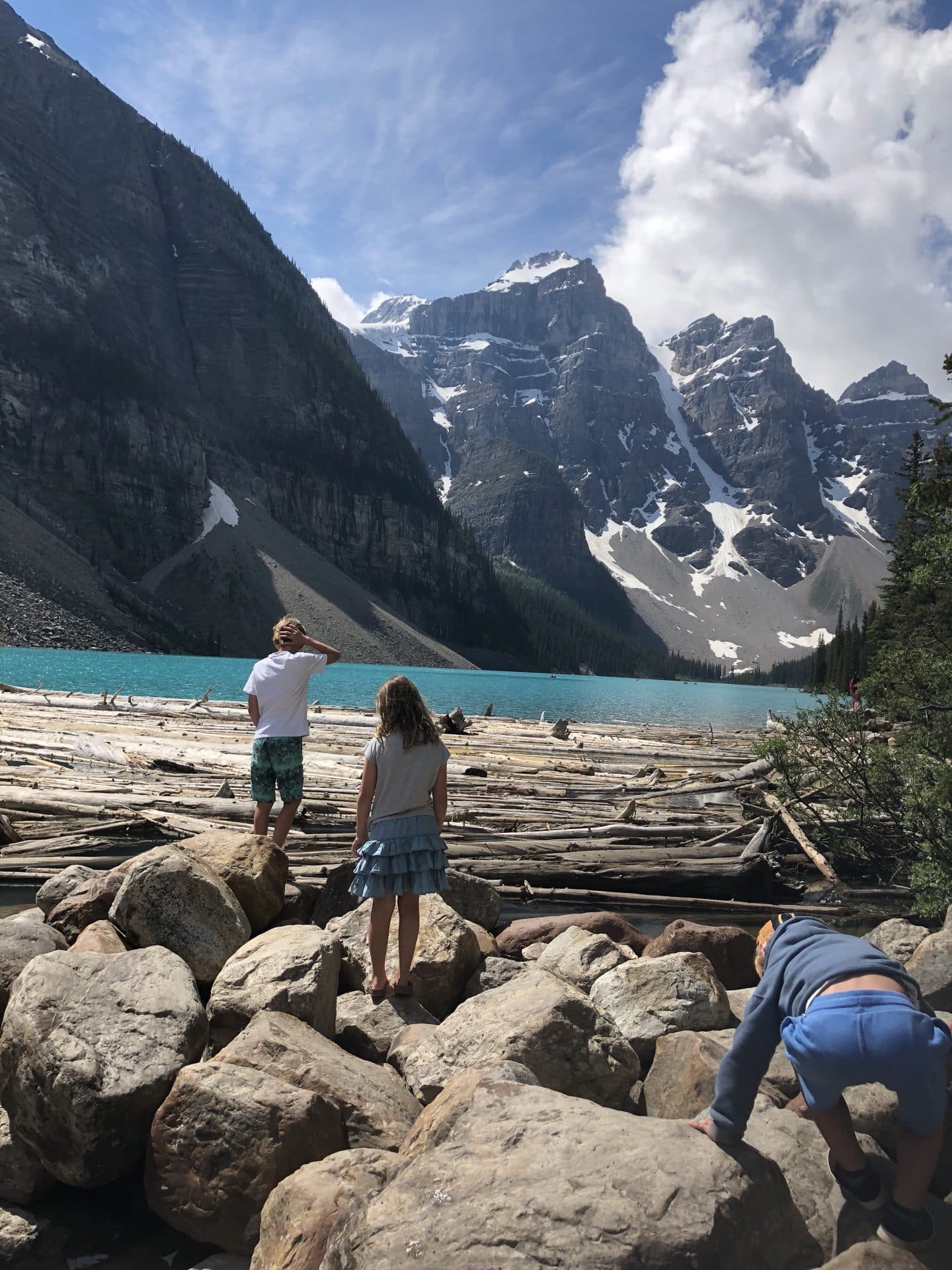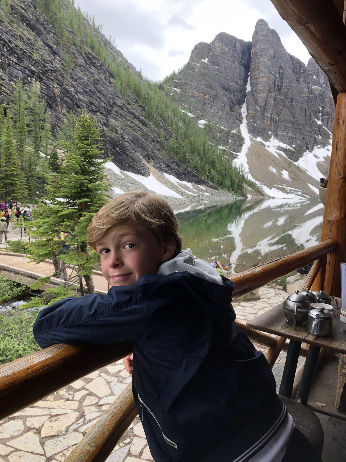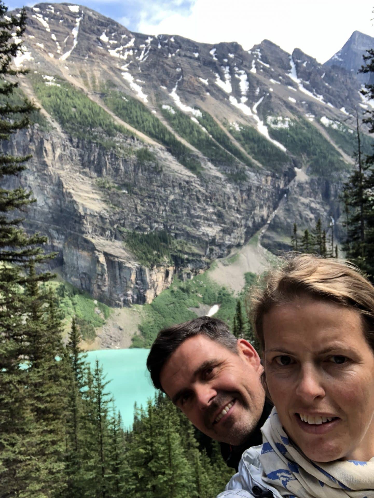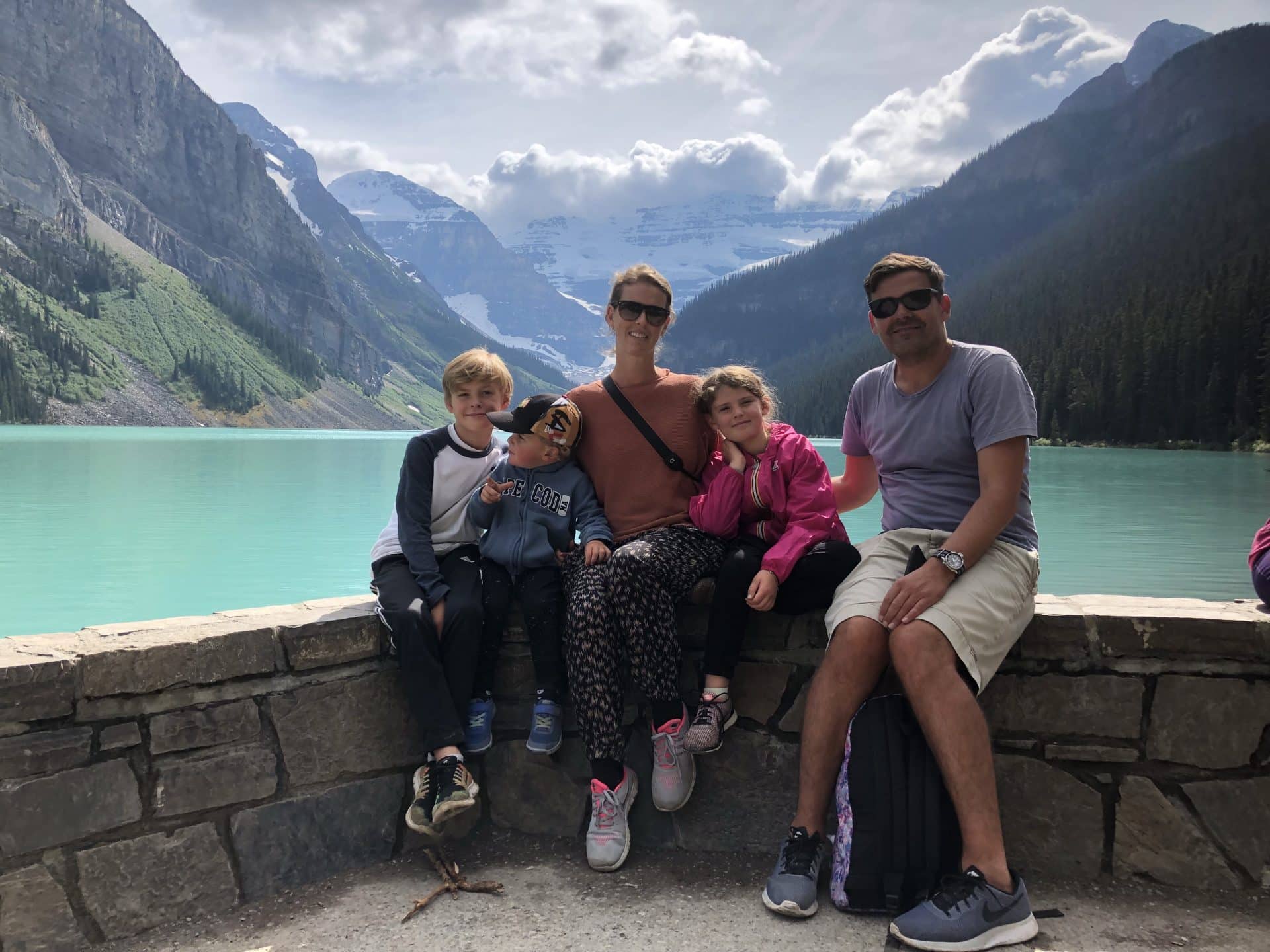 Næste morgen var målet Lake Louise. Vi kom til den meget smukke og udefinerbare blå-grønne farvet sø. Det var virkelig mindst lige så smukt som man ser på billeder. I ført vandregear begav vi os ud på den 3,7 km lange hike op i bjergene til Lake Agnes teahouse. Alle tre børn klarede turen op super flot, Walter hjulpet på vej på fars skuldrer. Vi kom op til Lake Agnes og det lille teahouse. Et tehus, hvor der ingen elektricitet er og vandforsyning. Alt bliver båret op hver morgen og maden lavet over bål, mens vandet til teen bliver hentet i søen. Super fint lille sted og idyllisk, at sidde med udsigten til Lake Agnes og spise scones og drikke te-lige som det hører sig til. Ungerne hyggede sig med de små jordegern, der kravlede rundt og håbede på en bid brød. Inden vi begav os ned ad igen, skulle vi lige have en lille snebolds kamp, da der flere steder lå klatter af sne. William og Frida tog sig en kælketur på numsen. Velankommet til campingpladsen gik Frida og Walter igang med at lave en heks i pap til vores Skt hans bål-vi havde nemlig ikke bål forbud som hjemme i Danmark. Til shu-bi-duas midsommervise grillede vi marshmallows og så heksen blive futtet af.