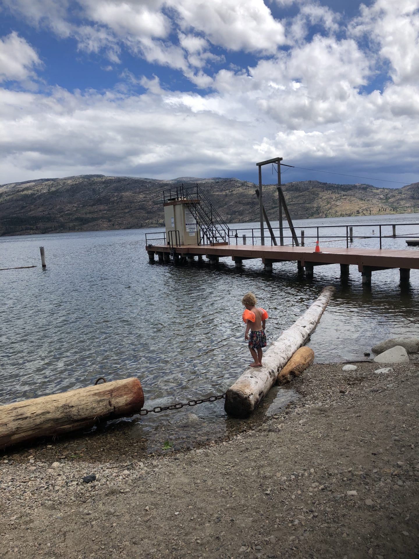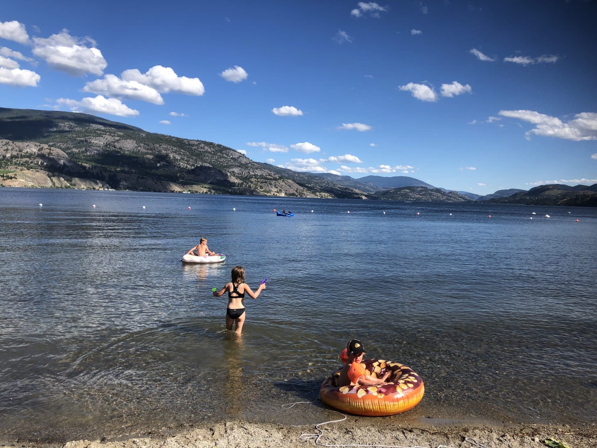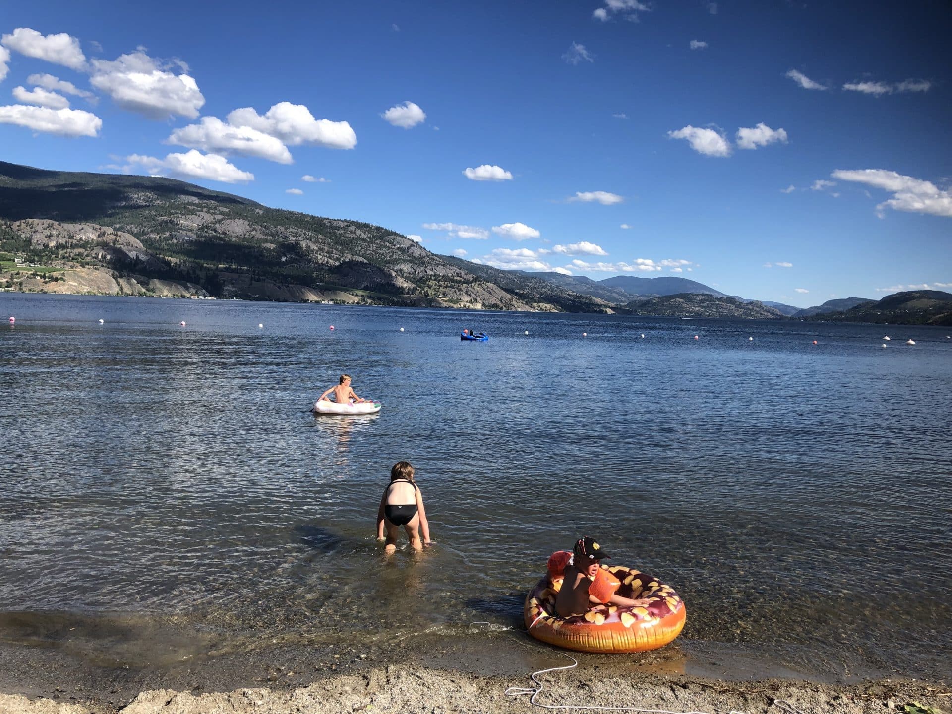 Første dag ved søen gik vi ned til “swimbay” et område i søen med vippe, svævebane og tømmerflåde. Her fik vi det meste af dagen til at gå. Vi havde nu en ekstra dag i Okanagan Valley som endnu ikke var booket og vi besluttede derfor at køre helt ned i sydspidsen til byen Penticton, der ligger mellem de to søer Okanagan Lake og Skaha Lake. Vi fandt en skøn campingplads helt ned til søbredden ved Skaha Lake med egen strand. Vejret var dejligt og hele dagen blev tilbragt på stranden.
