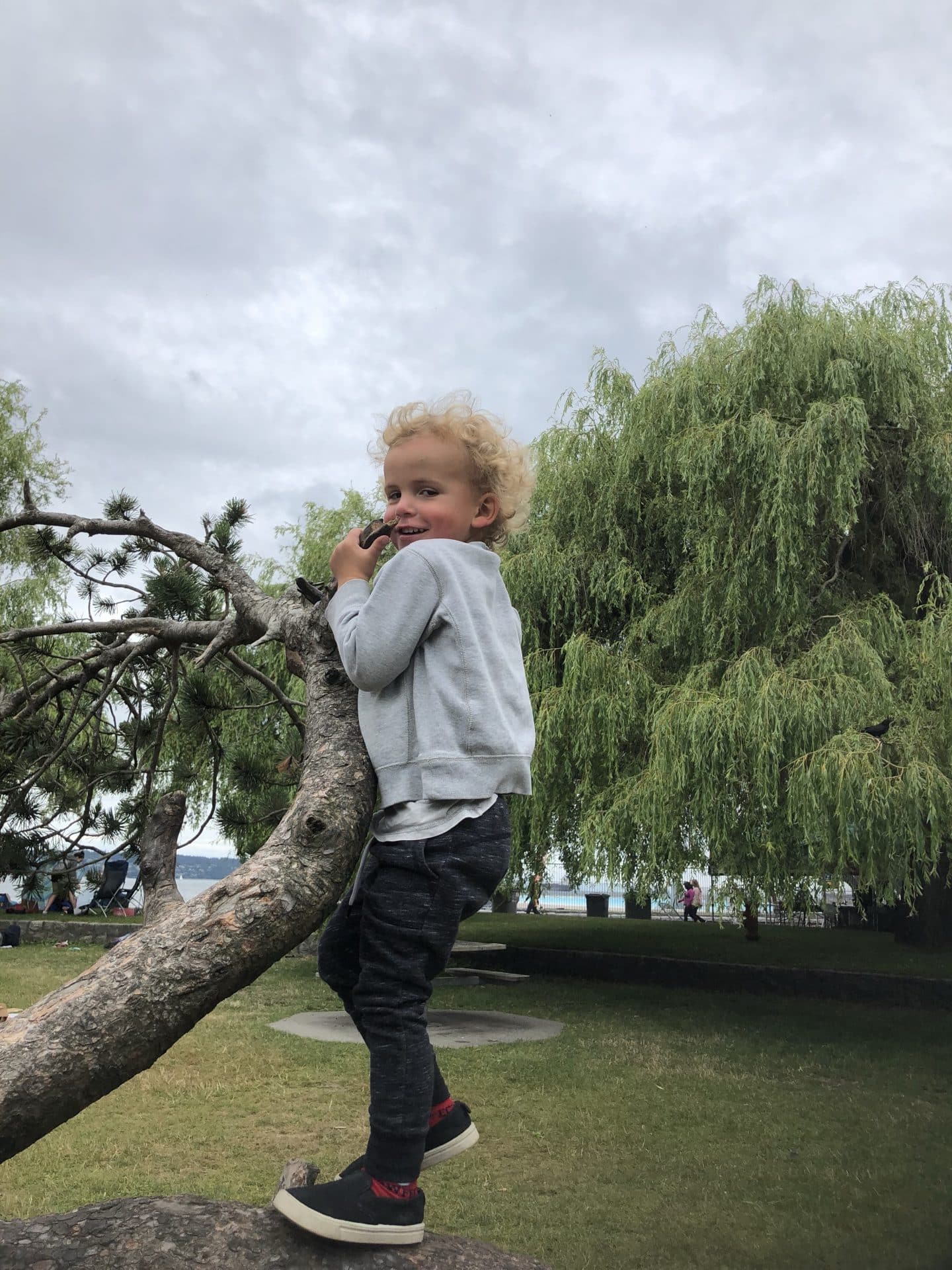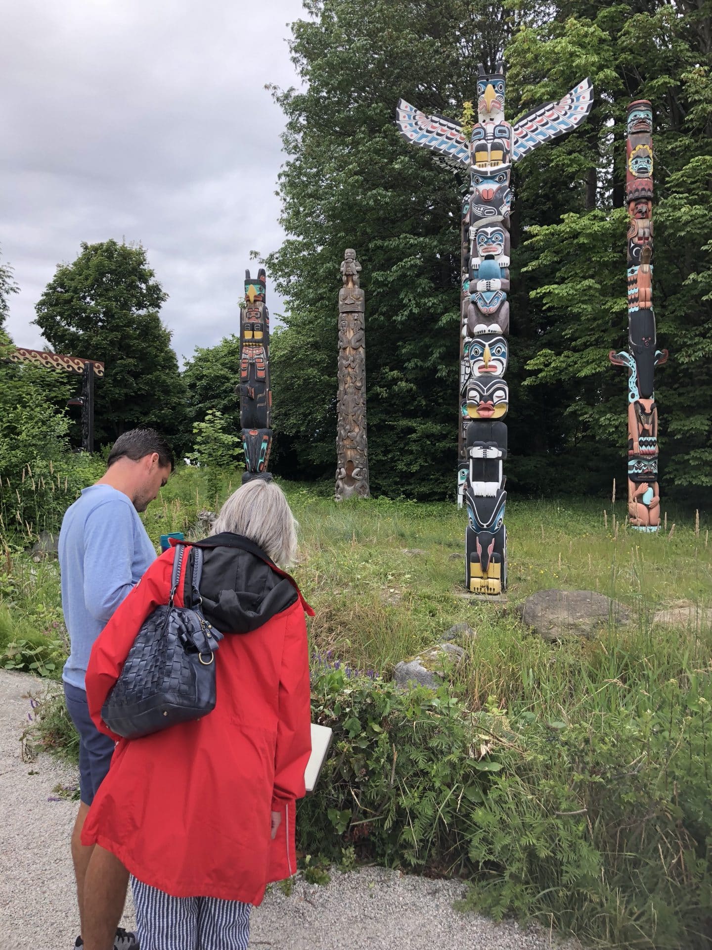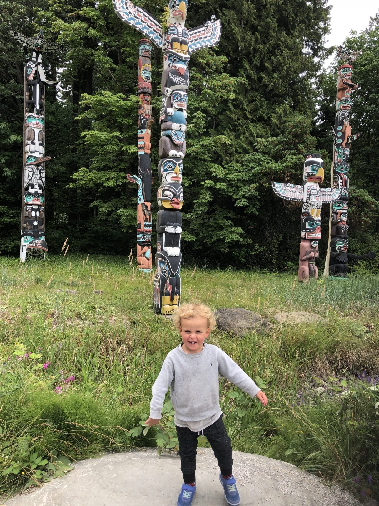 Onsdag kom vi hurtigt ud af fjerene og fik gjort os klar til at køre mod Vancouver lufthavn for at hente farmor. Vi glædet os alle til at se hende og et kendt ansigt. Vi nåede heldigvis frem før hun landede og stillede os klar med velkomstbanner-selvom Frida syntes det var ret så pinligt. Farmor blev vist rundt i mobilhomet og så gik turen til campingpladsen. Vi havde booket en campingplads i selve Vancouver(North Van) lige ved den store bro Lions gate Bridge, som har krydset utallige gange, når vi før i tiden besøgte Karen og Martin(Mine gudforældre), som nu er flyttet til Vancouver Island. Det viste sig at campingpladsen lå midt i “First Nations” området. Et område som indianerne er blevet tildelt og som de selv skal klare driften af. Bl.a. står der på skilte ved vejen ind i området, at der er på eget ansvar man køre på deres vej, da den ikke bliver vedligeholdt. Alle ansatte på campingpladsen var First nation People’s fra Squamish stammen. Fremme på campingpladsen vakte det glæde, at der var pool og tilmed nogle danske børn-William og Frida var i himlen. De badet og legede med de danske børn det meste af aftenen.