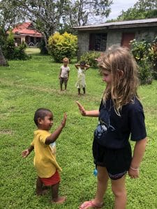 Søndag formiddag fløj vi mod nye eventyr i Fiji. Vi landede på hovedøen Viti Levu, i Nadi lufthavnen, udtales Nandi, af guitarspillende lokale i Hawaii-skjorter lige som man forestiller sig det på en sydhavsø. Folk var meget smilende og venlige. Vi tog en taxa til vores første bestemmelsessted-Tambua Sands Resort, der ligger på den sydlige del af Viti Levu, det område som hedder Coral Coast. Det er det eneste sted på hovedøen hvor deres ydre koral rev, barrier Reef, kommer tæt på Viti Levu. Det var således kun nogle få hundrede meter ude, og man kunne konstant høre larmen fra det. Vi så kun dette barrier reef en gang til under hele vores ophold og det var som bølgetoppe langt ude i horisonten ved Mamanuca Islands, som var det sidste sted vi boede i Fiji. Det var mørkt da vi kom frem og blev vist ned til vores bungalow endnu en gang i første række til havet. Man kan virkelig godt vende sig til at falde i søvn til havets skvulpene bølger. Vi vågnede op næste morgen til en fin hvid sandstrand med palmer i vandkanten og et væld af skaller, konkylier og koraller på stranden. På resortet var der hver dag forskellige aktiviteter, så første dag gik vi med en af de ansatte til hans lille landsby på den anden side ad vejen og gennem deres plantage, der bugnede af frugter og grønsager. Landsbyens huse var primært lavet af gamle brædder, plader og så det obligatoriske bliktag. Han forklarede de havde cirka 50 huse og det var en traditionel fijiansk landsby med kirke og det vi nok ville kalde et forsamlingshus. Selvom alt så meget fattigt ud, så mødte vi kun smilende folk og især børn med et stort Bula. Bula er det mest brugte ord i Fiji og betyder både hej, velkommen og goddag, og det bliver flittigt brugt af alle. Hjemme på resortet igen var det blevet tid til først “smash the Watermelon” og bagefter en rugby match med børn, voksne, ansatte og lokale. Rugby er den klart førende sport i Fiji og de bryster sig fortsat over at have vundet verdensmesterskabet 3 gange, for 7 mands hold, senest i 2018. William og Frida fandt sig nogle Australske drenge at lege med især ved pool-bordet som blev flittigt brugt.