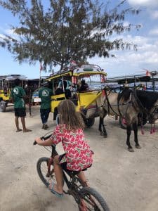 Tirsdag morgen blev vi kørt til Padang Bai, hvorfra vi skulle sejle til Gili Trawangan. Vi havde som nævnt før valgt at holde os til den største af Gili-øerne, da vi havde en ide om, at den var mest genopbygget efter det voldsomme jordskælv som ramte Lombok og øerne i august. Sidst vi var her sejlede vi fra Lombok og nu skulle vi så sejle fra Bali. Vi havde hørt skrækhistorier om at sejlturen var rigtig slem og at folk ofte blev rigtig søsyge på turen. Vi havde den mest rolige sejltur over. Ungerne sad og så Minions på tv-skærm og Kasper og jeg sad oppe på dækket i solen, hørte Bob Marley i højtaleren og delte en øl. Det var ren svir.