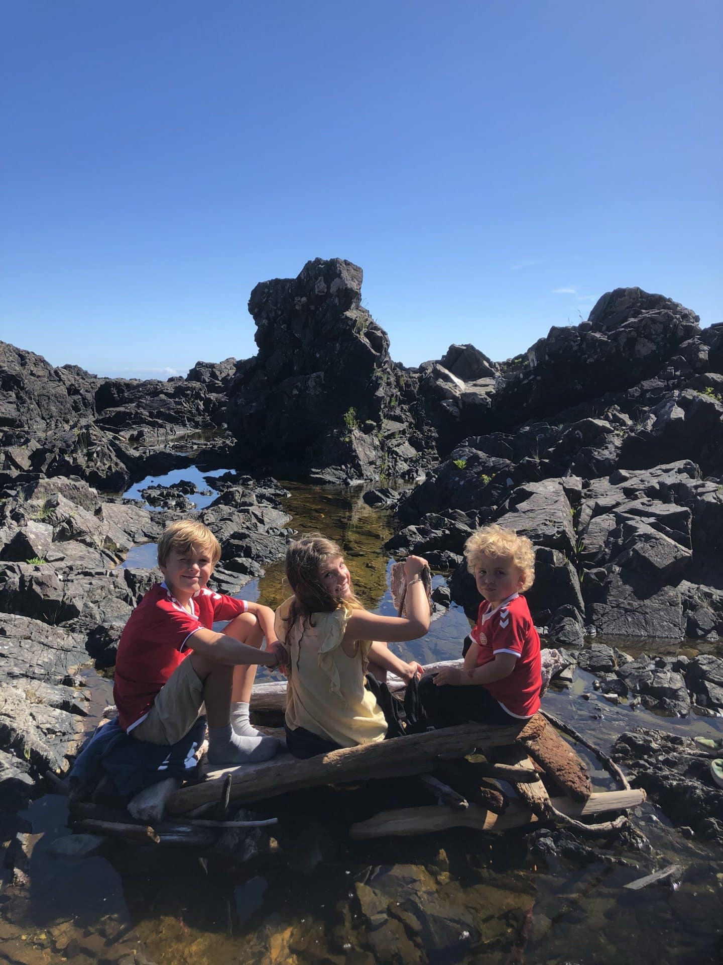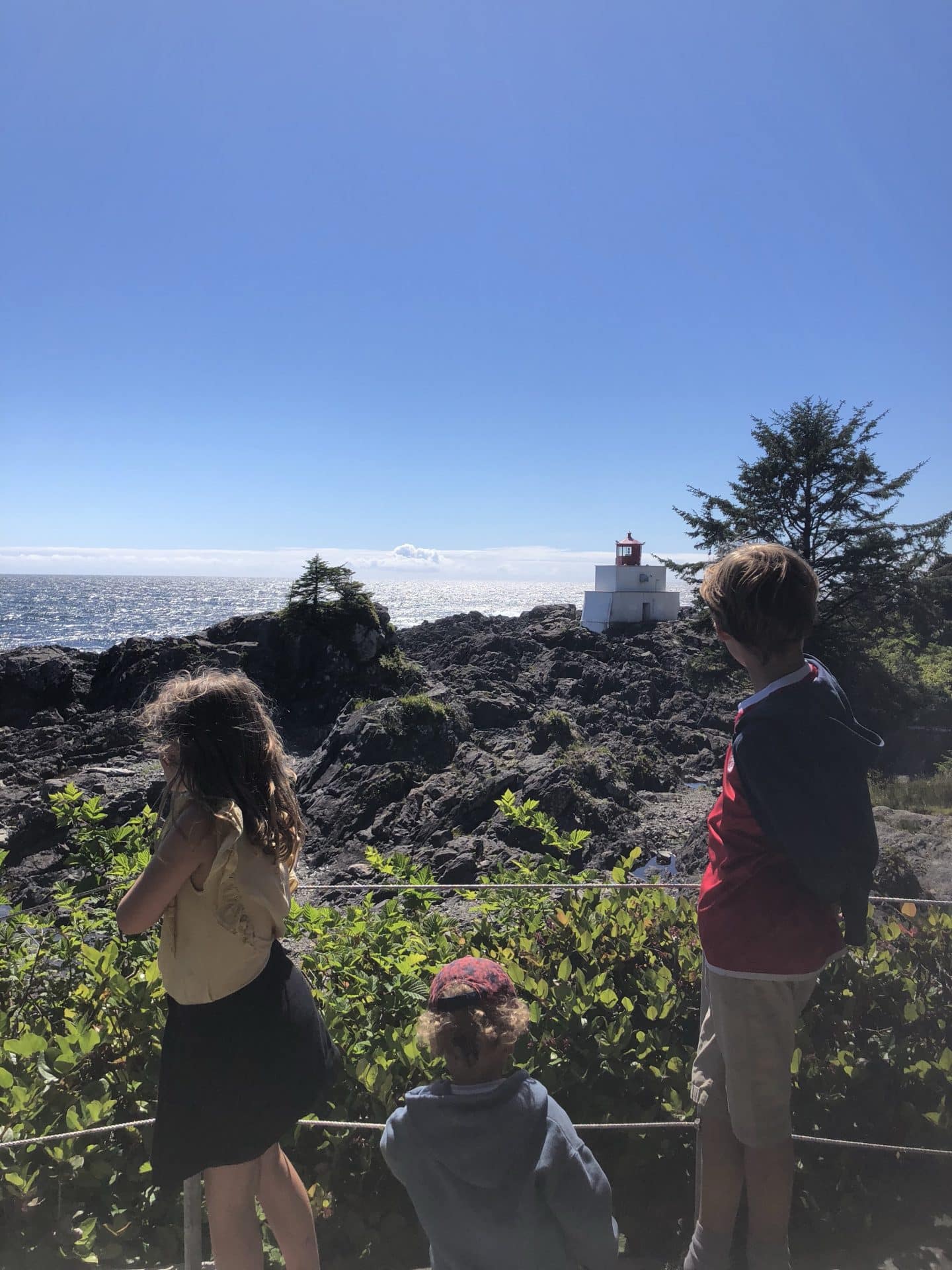 Søndag var det Canada-Day-Canadas nationaldag og samtidig også den dag Danmark spillede landskamp mod Kroatien. Vi gjorde os klar til kamp med landsholdstrøjer, flag på bilen og kinderne. Så kørte vi ned til havnen, hvor Canada-Day blev fejret med musik, dans og kage. Vi faldt heldigvis ikke helt ved siden af med vores rød-hvide farver. Vi satte os på en bænk med Ipad’en i skødet for at følge med i den nervepirrende landskamp. Efter vi var kommet os over den store skuffelse, besluttede vi at gå en tur langs Stillehavet. Vi kørte ud mod et fyrtårn, hvor vi gik en dejlig tur. Børnene byggede igen tømmerflåde mellem klipperne, og så fandt vi en lille øde strand hvor det blev til en dyppetur i Stillehavet.