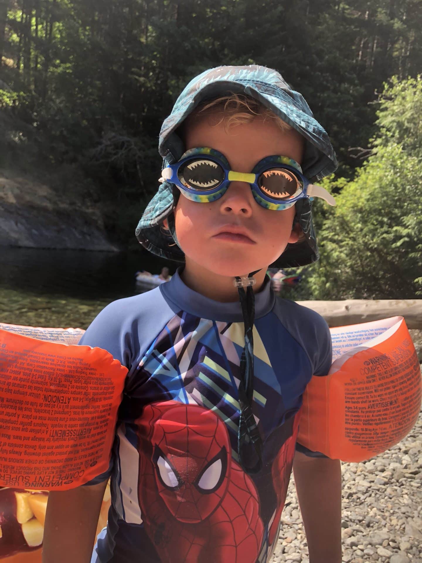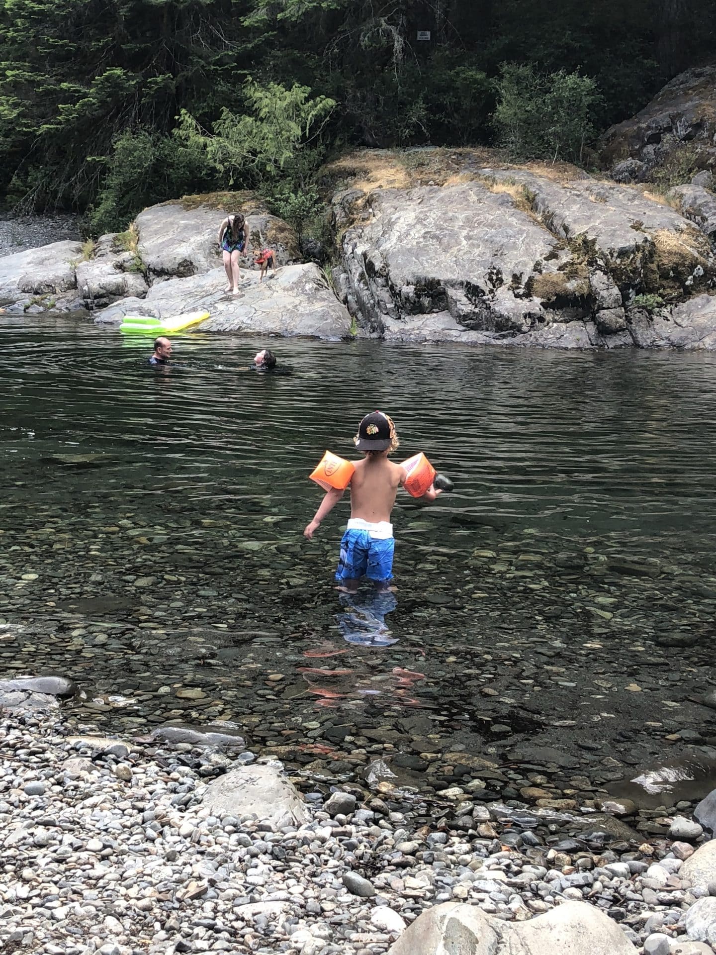 Næste dag spiste vi morgenmad alle sammen på hotellet og gik en tur ud langs stranden. Mormor og Bufar ville køre et smut forbi Karen og Martin, der var meget spændte på at se dem. Min mor og Karen er ungdoms veninder og mødte hinanden første gang på Vancouver Island før jeg blev født. De havde ikke set hinanden siden 2011. Da Karen og Martin alligevel skulle ud til os på Sooke dagen efter, besluttede vi at blive hjemme. Vi kørte i stedet til Sooke Potholes for at bade, da vejret var skønt. Sooke Potholes er nogle fordybninger i klipperne skabt af gletchere, og hvor man kan bade i meget klart men også lidt koldt vand. Vi havde en skøn eftermiddag og ungerne boltrede sig i vandet på deres oppustelige doughnut og cupcake. Som en pige på et tidspunkt sagde “I Think that family likes food” – der havde vi også et vandmelon håndklæde og et pizza håndklæde. William og Frida fandt på at rutsje ned ad de glatte gletcher klipper.