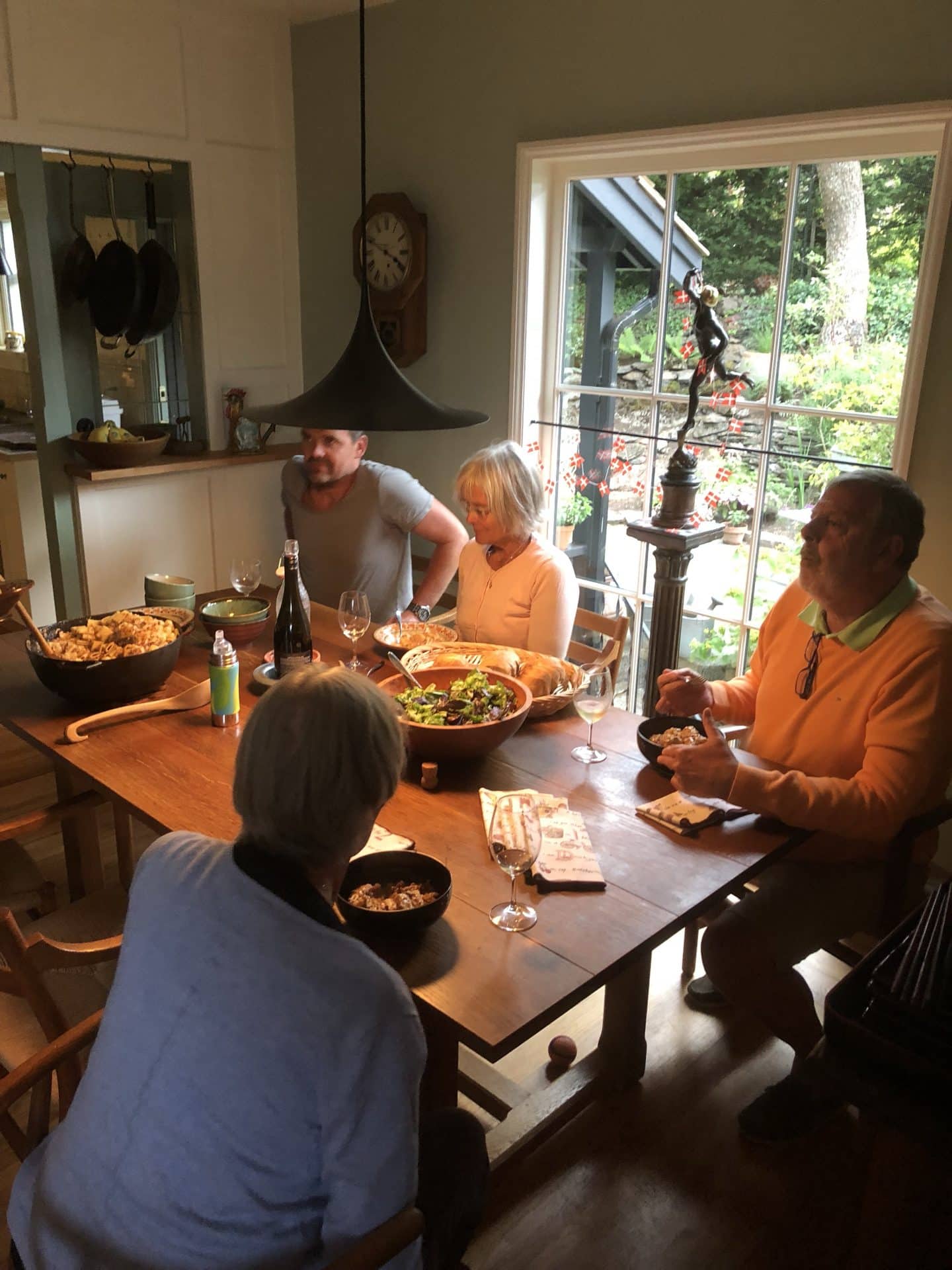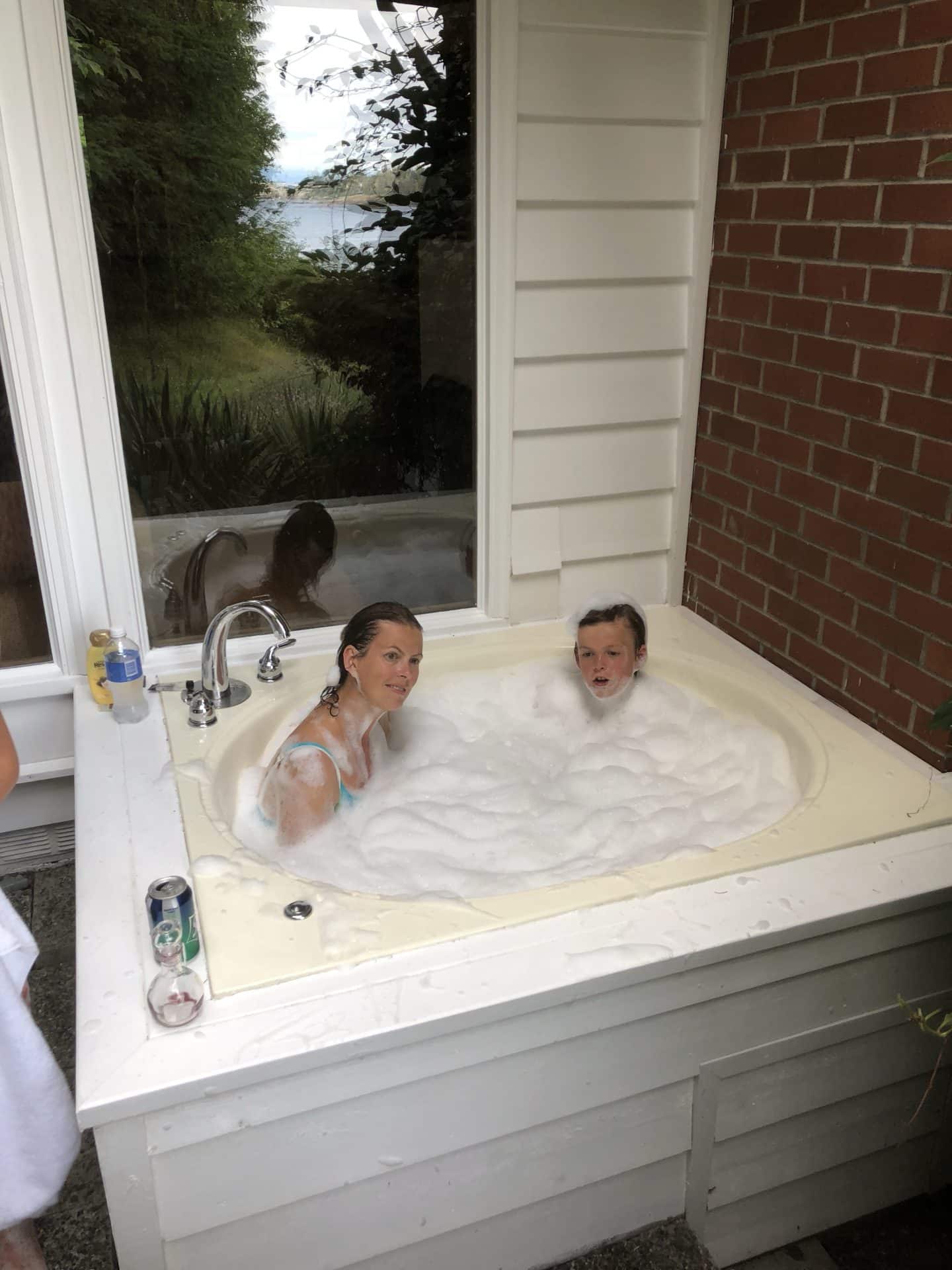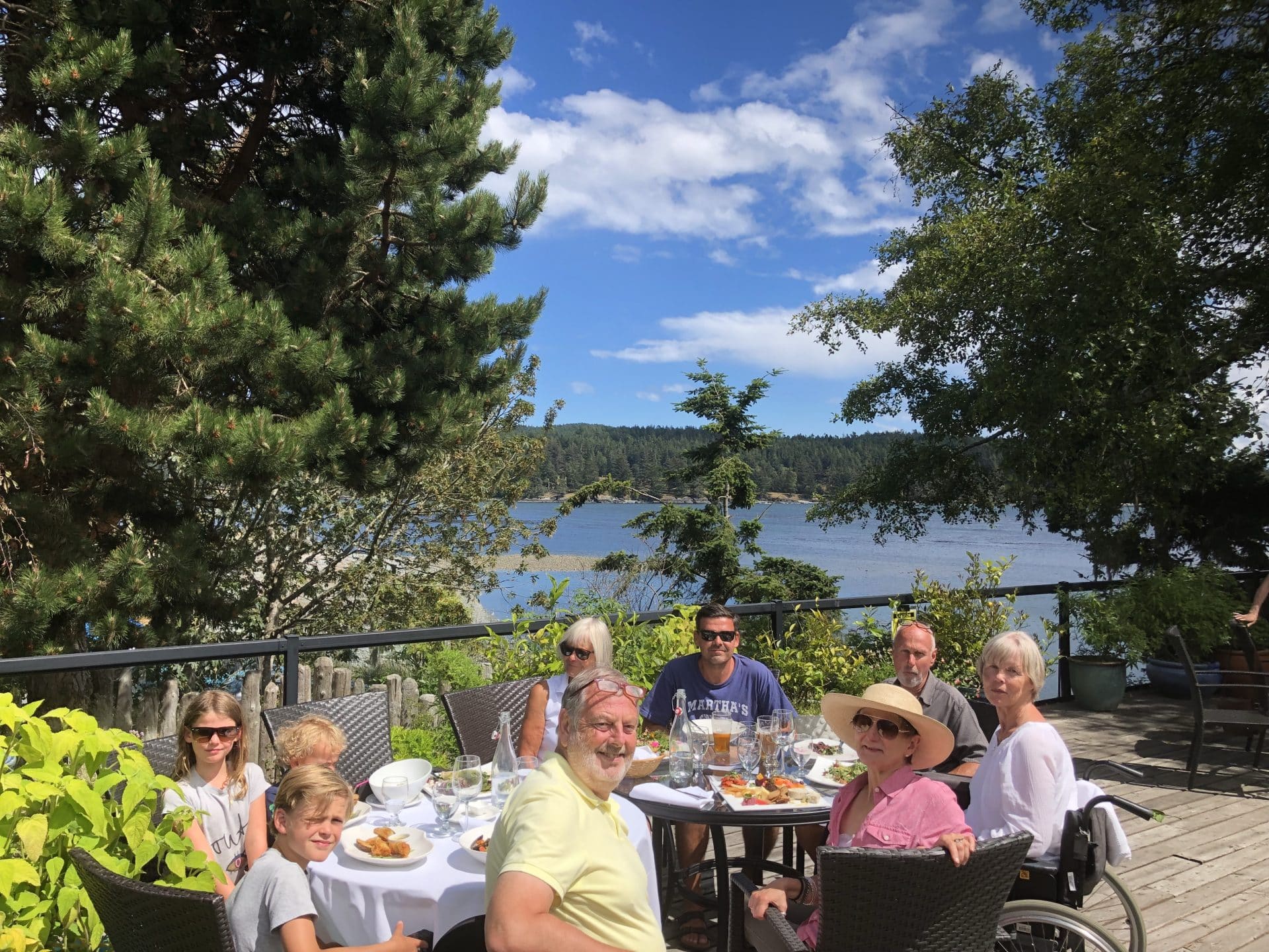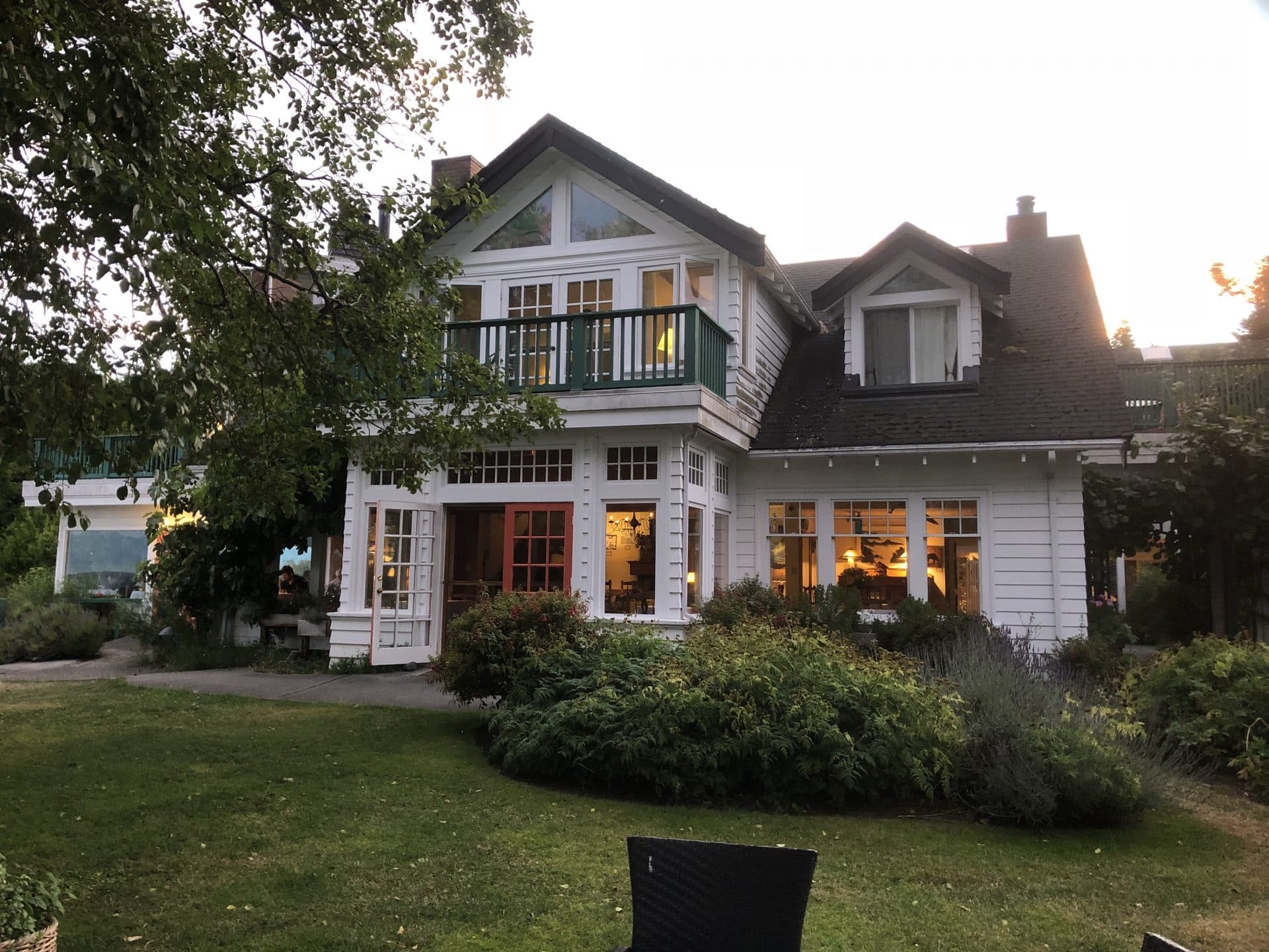Tirsdag morgen gik turen tilbage tværs over øen til et campsite ved byen Ladysmith, hvor vi skulle bo to nætter. Undervejs gjorde vi stop i Port Alberni, der faktisk er en havneby selvom den ligger midt inde på øen. Der går nemlig et inlet ind til den. Efter nogle dage uden pool, sprang ungerne glade i vandet på campingpladsen. Mormor og Bufar var samme dag ankommet til byen Sooke på Vancouver Island og selvom vi oprindeligt havde to nætter her i Ladysmith, blev vi enige om at vende næsen mod dem i Sooke. Så efter en formiddag ved poolen og golf på par 3 bane for William, Kasper og farmor kørte vi afsted. Vi ankom til Sooke Harbour House, hvor mormor, Bufar, farmor og mine gudforældre Karen og Martin skulle bo. Sooke Harbour House er det skønneste hotel helt ud til vandet med alskens kunstværker rundt om i haven og en køkkenhave der bugner af friske grønsager og frugter. Vi boede her for 2 år siden, så det var dejligt at være tilbage og vise det til farmor og mormor(Bufar var med os første gang). Vi bankede på mormor og bufars dør og alle var meget glade for at se hinanden igen. Min far havde spurgt, om vi måtte parkere vores mobilhome på stedet, så vi ikke behøvede at finde campingplads. Det måtte vi heldigvis gerne. Vi spiste den dejligste middag på hotellet, hvilket kun kan anbefales. Godt nok venter man lidt længe på maden, MEN alt er også lavet helt fra bunden og med egen produktion af alle råvarer.