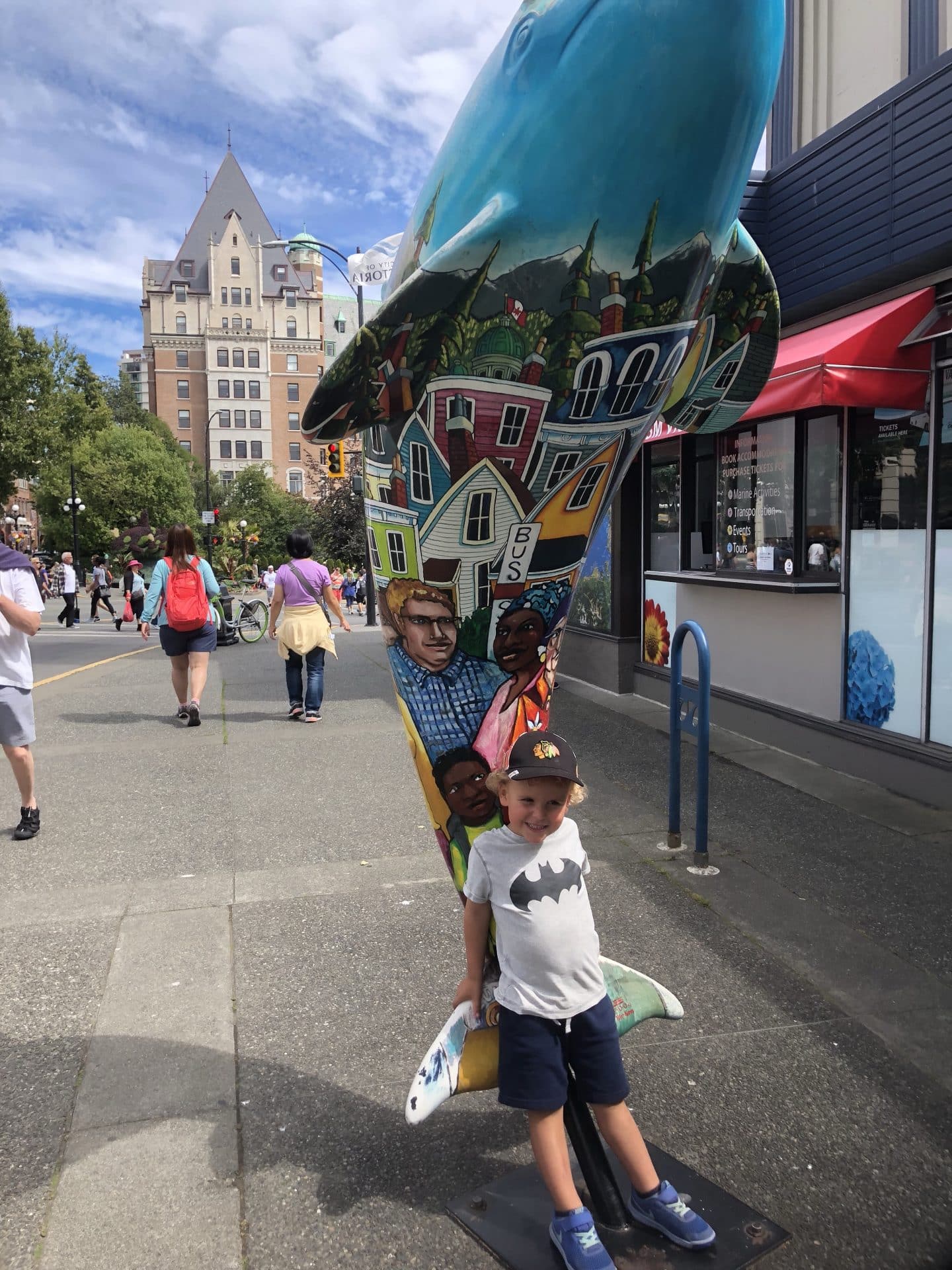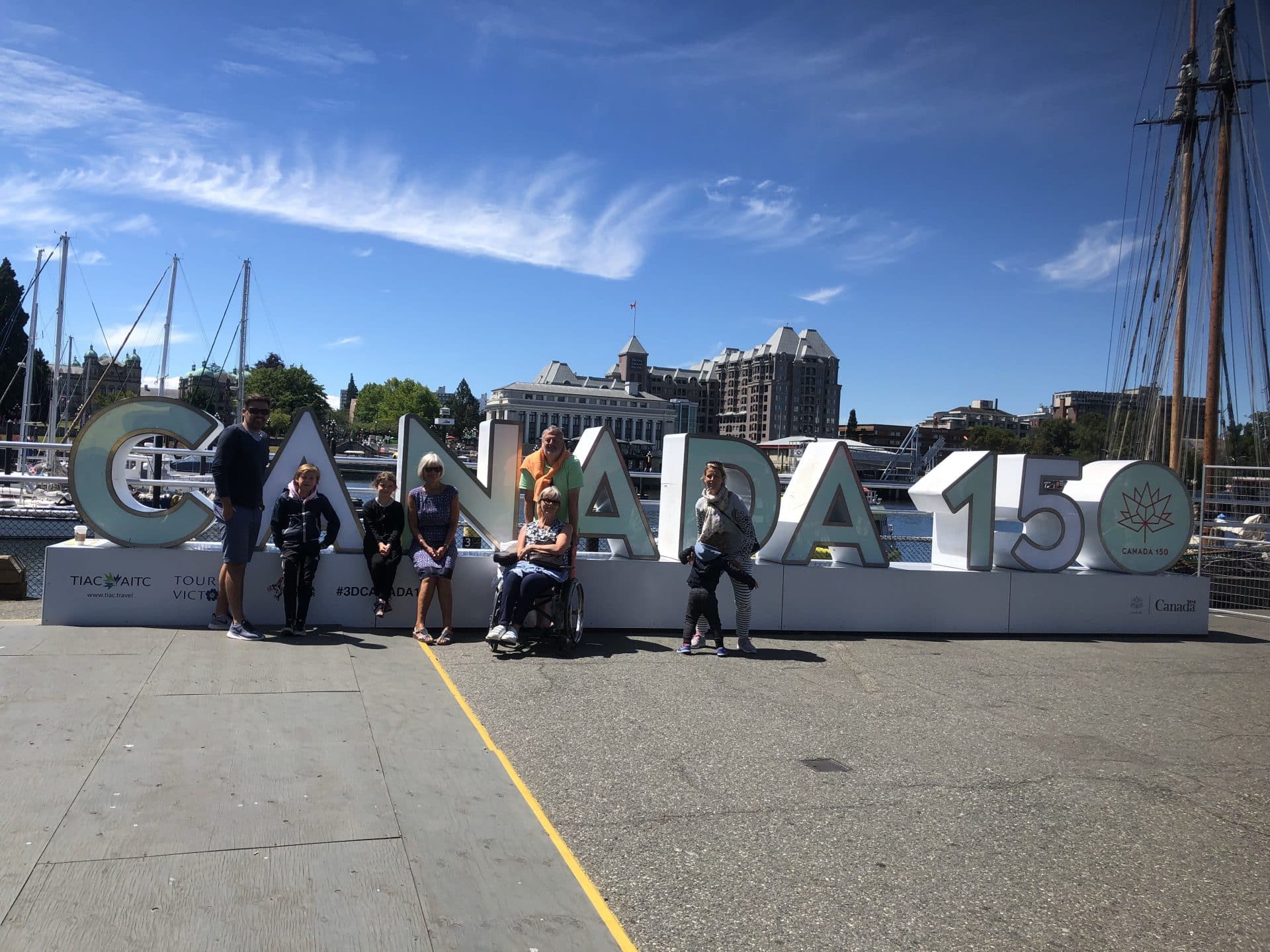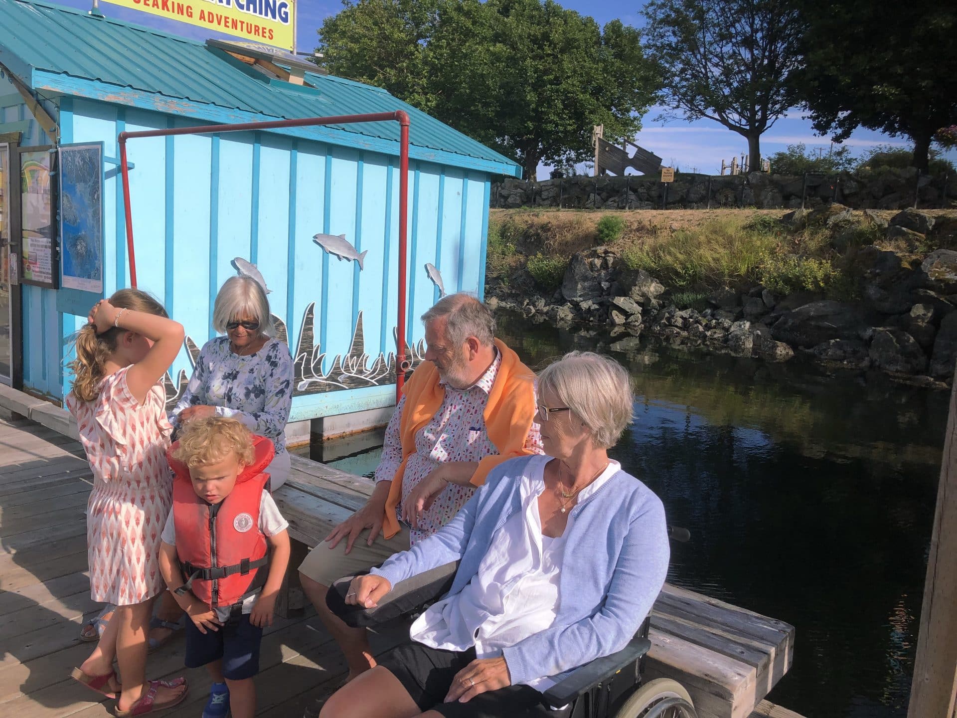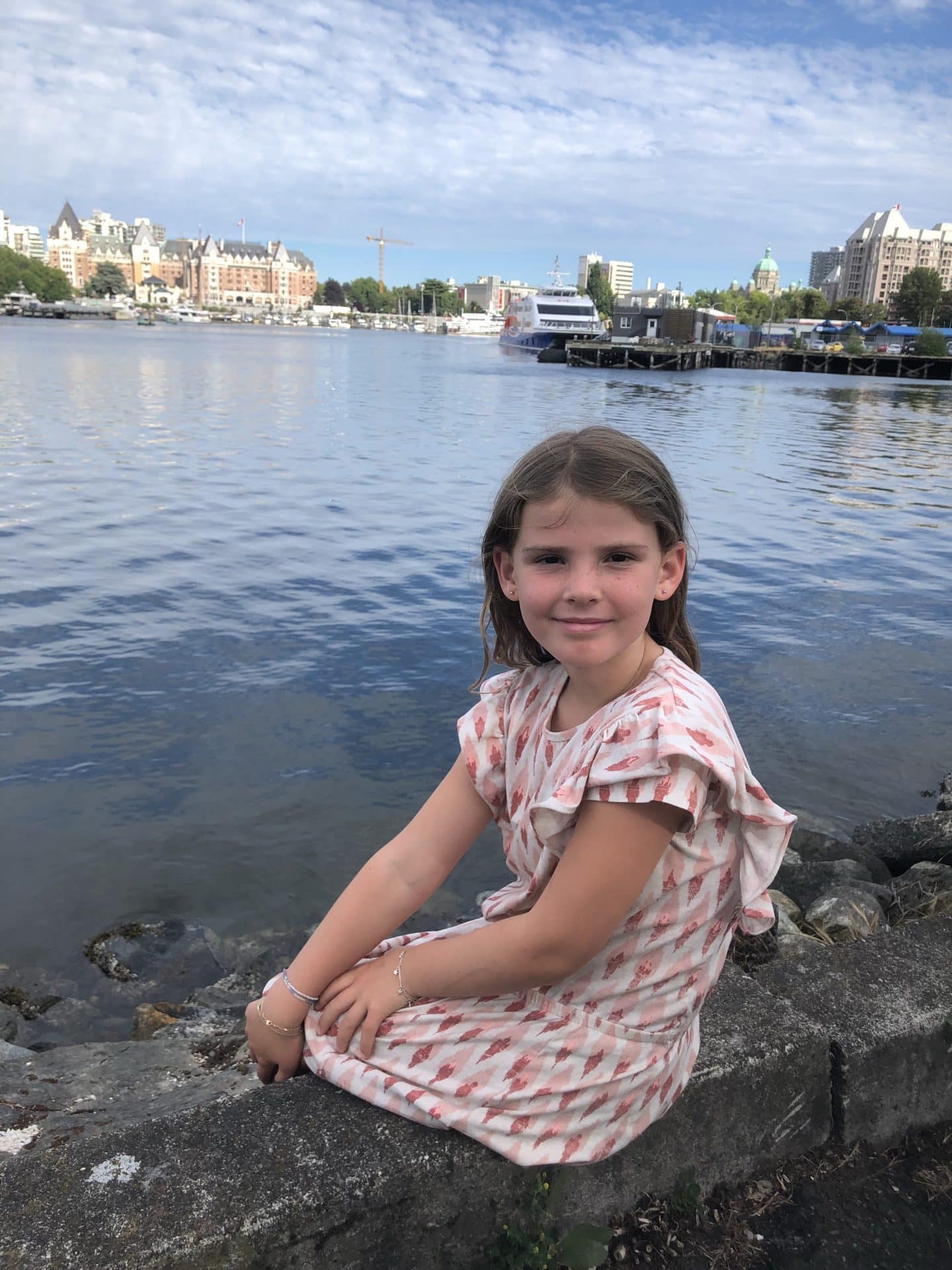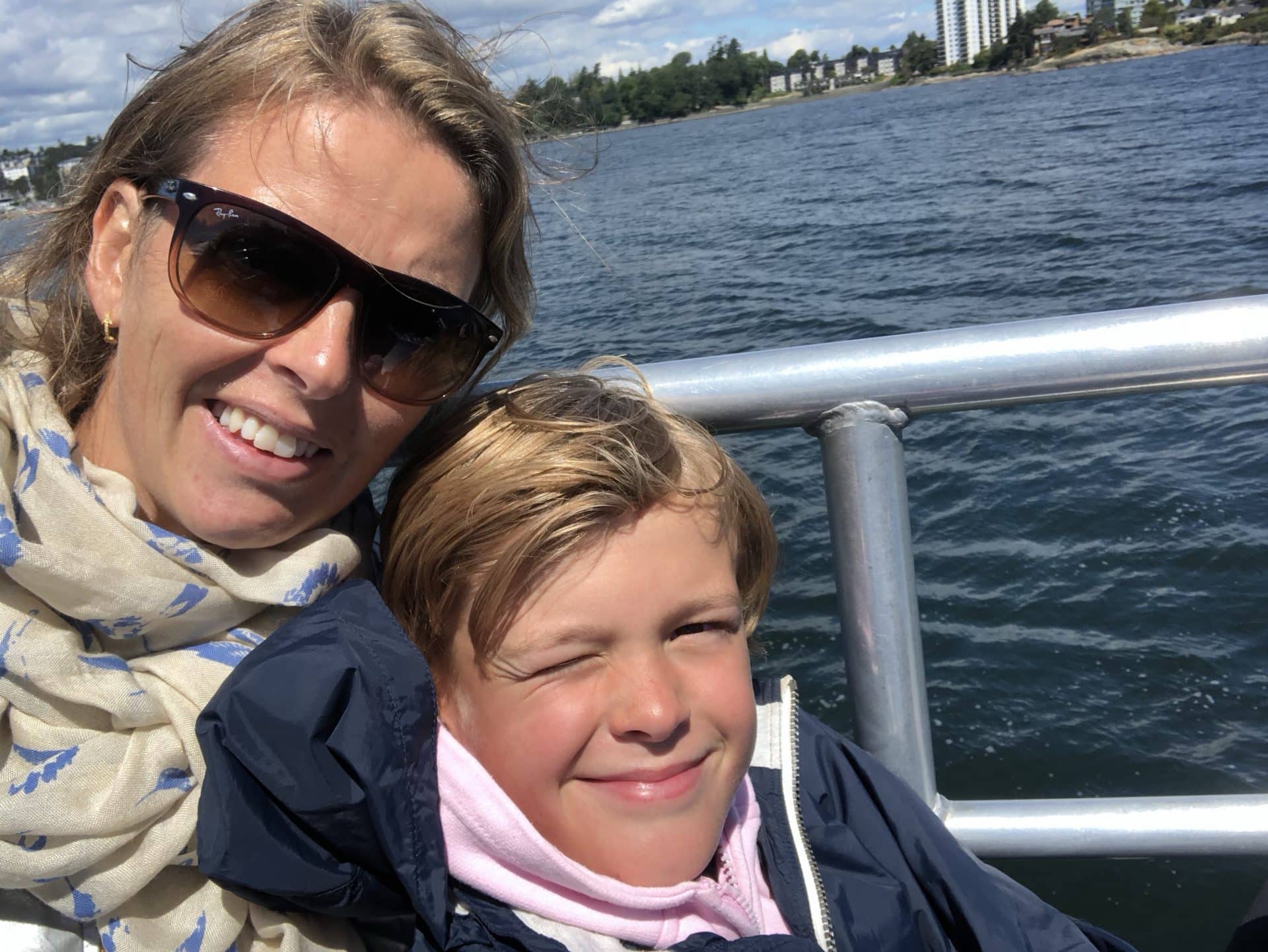 Efter fire dejlige dage i Sooke gik turen nu videre til Victoria – hovedstaden i British Columbia. Vi havde her valgt at bo på hotel, da campingpladsen lå uden for byen. Victoria er den skønneste lille(af en hovedstad at være) by lige ud til vandet. Her ligger den flotte parlaments bygning ned mod den meget livlige havn, hvor vandflyene lander og letter, taxibådene sejler på kryds og tværs og alle whale watching båden sejler ud fra. Hjemmefra havde jeg i et kort sekund fået lovet Frida huller i ørerne på vores rejse. Vi blev enige om at Victoria nok var stedet at gøre det. Så med en lidt nervøs Frida i hånden gik vi ned til smykkebutikken og fik skudt hullerne i. Det er jo faktisk et ret fint minde at have fra vores rejse. Kasper, William og Frida ville gerne vise farmor BC museum, så de fire gik derind, mens Walter og jeg var sammen med mormor og Bufar. Bagefter gik vi alle ud langs vandet til Victorias Fishermans Wharf. Fishermans Wharf består af 3-4 lange flyde broer med små spisesteder og en samling af private farverige husbåde. Vi satte os i solen og spiste dejlig sushi til aftensmad. Mandag havde vi aftalt at tage hjem til Karen og Martin, der bor i et villaområde i Victoria ved kysten. Deres ældste søn Cleve var også på besøg med hans kone og datter, for at hilse på os. Vi gik alle sammen en tur i området og kørte derefter til Oak Bay havn for at spise frokost. Her var vi også sidste gang og ungerne kunne huske, at de fodrede to habour seals. Denne gang var der otte sæler som de fik lov til at fodre med fisk. Vi spiste alle sammen middag hos Karen og Martin i deres helt igennem skønne hus.