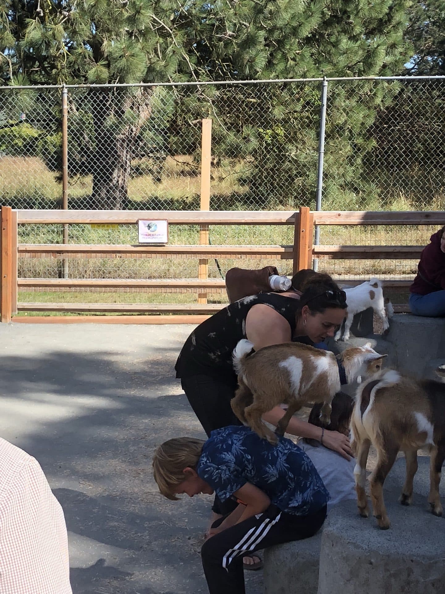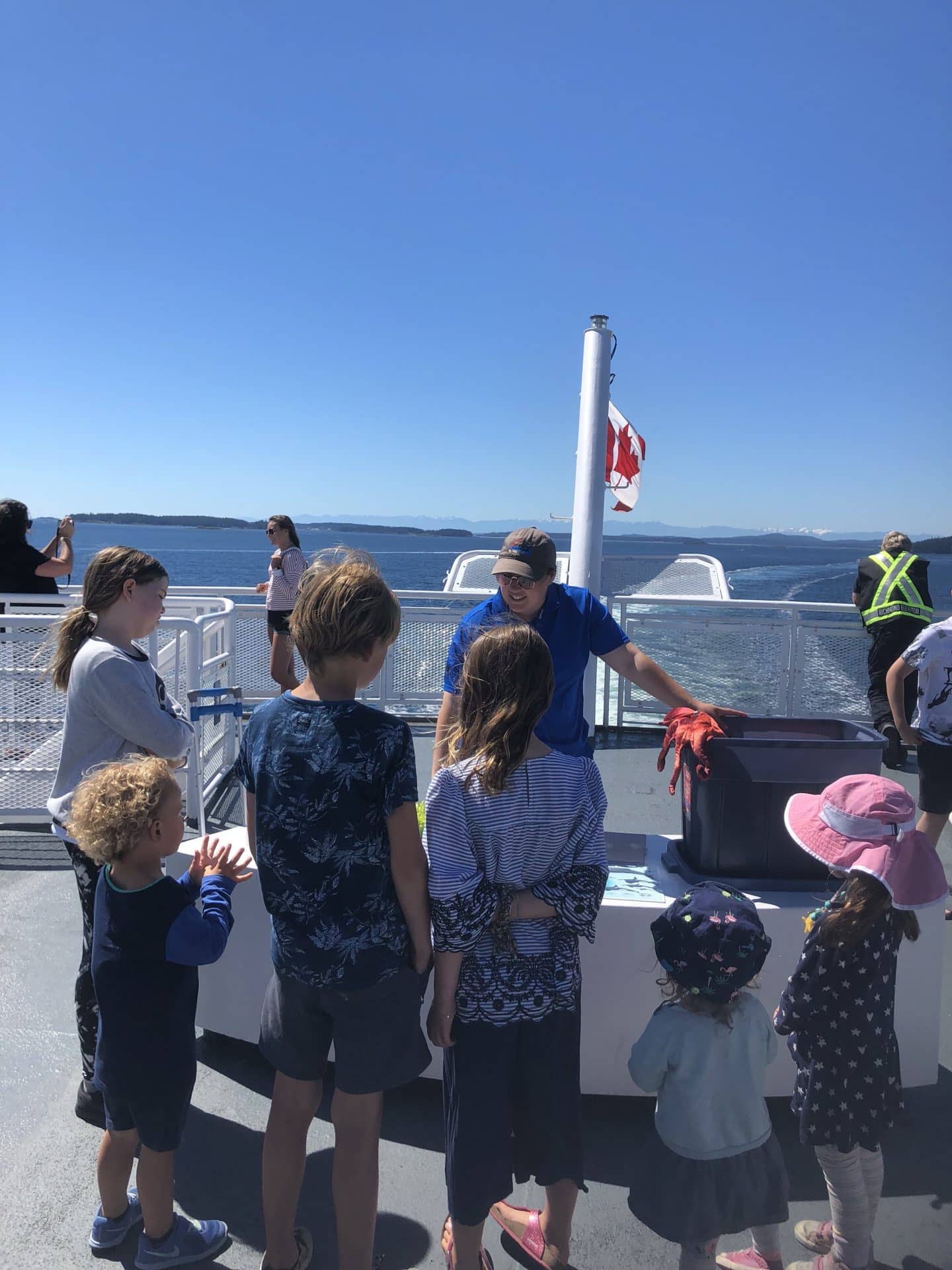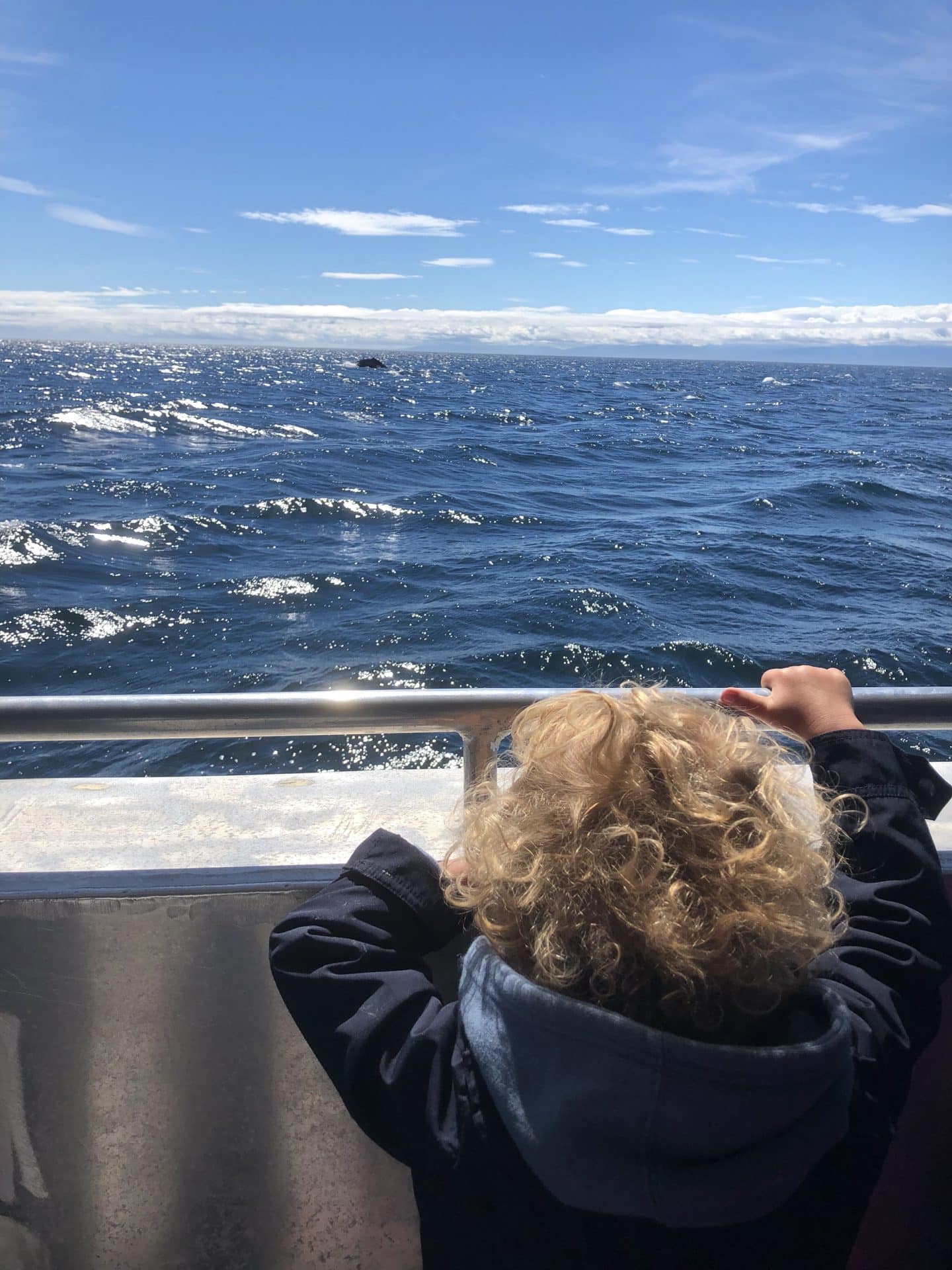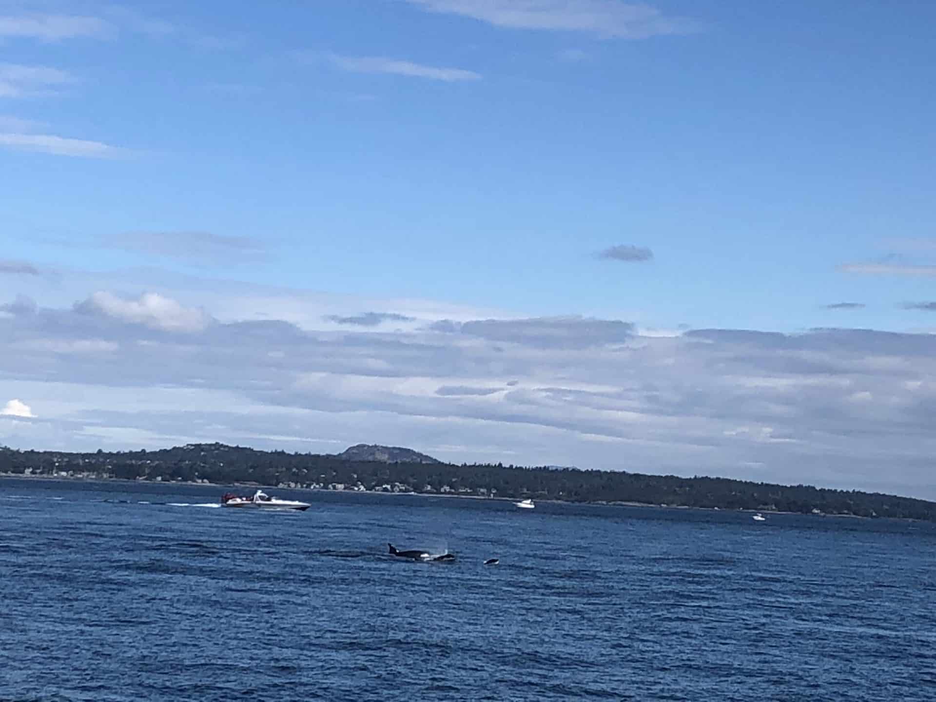 Næste morgen stod vi tidligt op, da det var tid til whale watching. Vi sejlede ud fra havnen og blot 10 minutter ude, dukkede to spækhugger familier op med 5 i hver. Vi fulgte dem længe – endnu en gang et fascinerende syn(vi så dem også sidst vi var her). Vi sejlede længere ud og pludselig dukkede også en kæmpe pukkelhval op fra havet. Det er virkelig et imponerende og stort dyr. Tilbage i havnen igen ventede mormor, Bufar og farmor på os og vi spiste frokost sammen, mens der blev set Belgien-Frankrig i fjernsynet. Vi kørte herefter til Beacon Hill parken, hvor der er en lille “petting zoo”. Her brugte børnene meget tid med gederne og især William syntes det var en fest at få gederne til at hoppe op på hans ryg – Walter og Frida var lidt mere tilbageholdende. Vi kørte igen til Karen og Martin for at spise middag-vi skulle nemlig have “hjemmefanget” laks. I nærheden af deres hus er en kæmpe ørnerede – en Bald headed eagle(en hvidhovedet havørn). Vi stod neden under reden og kunne se rester af store fugle og fisk ligge på vejen. Oppe på de øverste grene sad to gigantiske ørne og spejdede efter os, man var næsten bange for at de kunne finde på at suse ned og nuppe en. Martin fortalte også at de flere gange havde set den flyve over dem med en Odder i kløerne eller store stykker fra en sæl. Det var sidste aften med Karen og Martin, så vi tog den store afsked med dem. Altid lidt trist når man ikke ved, hvornår man skal ses igen.